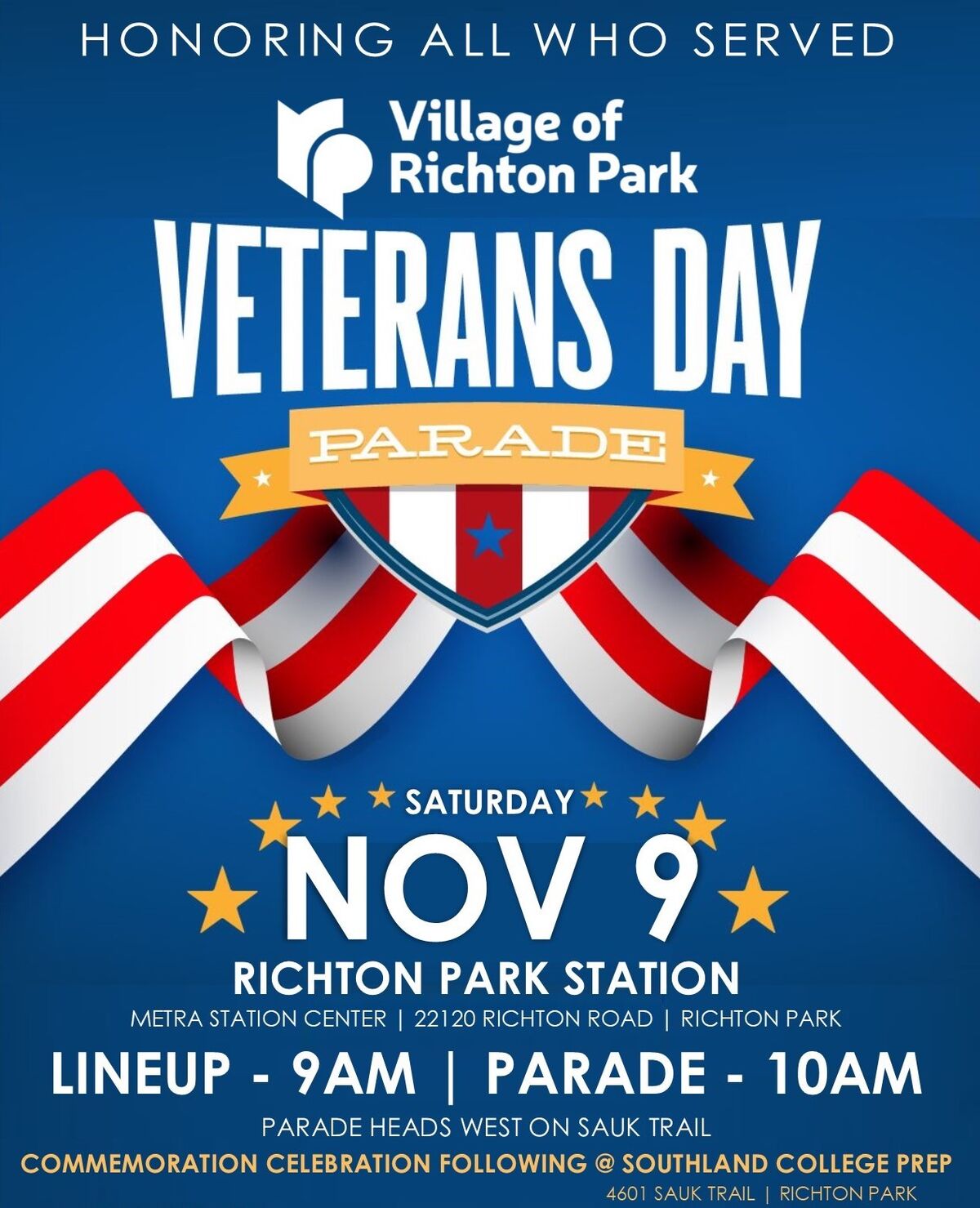 The Southland Ambassador Band and Marching Lady Eagles will join the community in honoring and celebrating all those who have served our country by participating in the marching procession. The parade will begin at the Richton Park Metra Station, moving WEST on Sauk Trail to Southland College Prep.