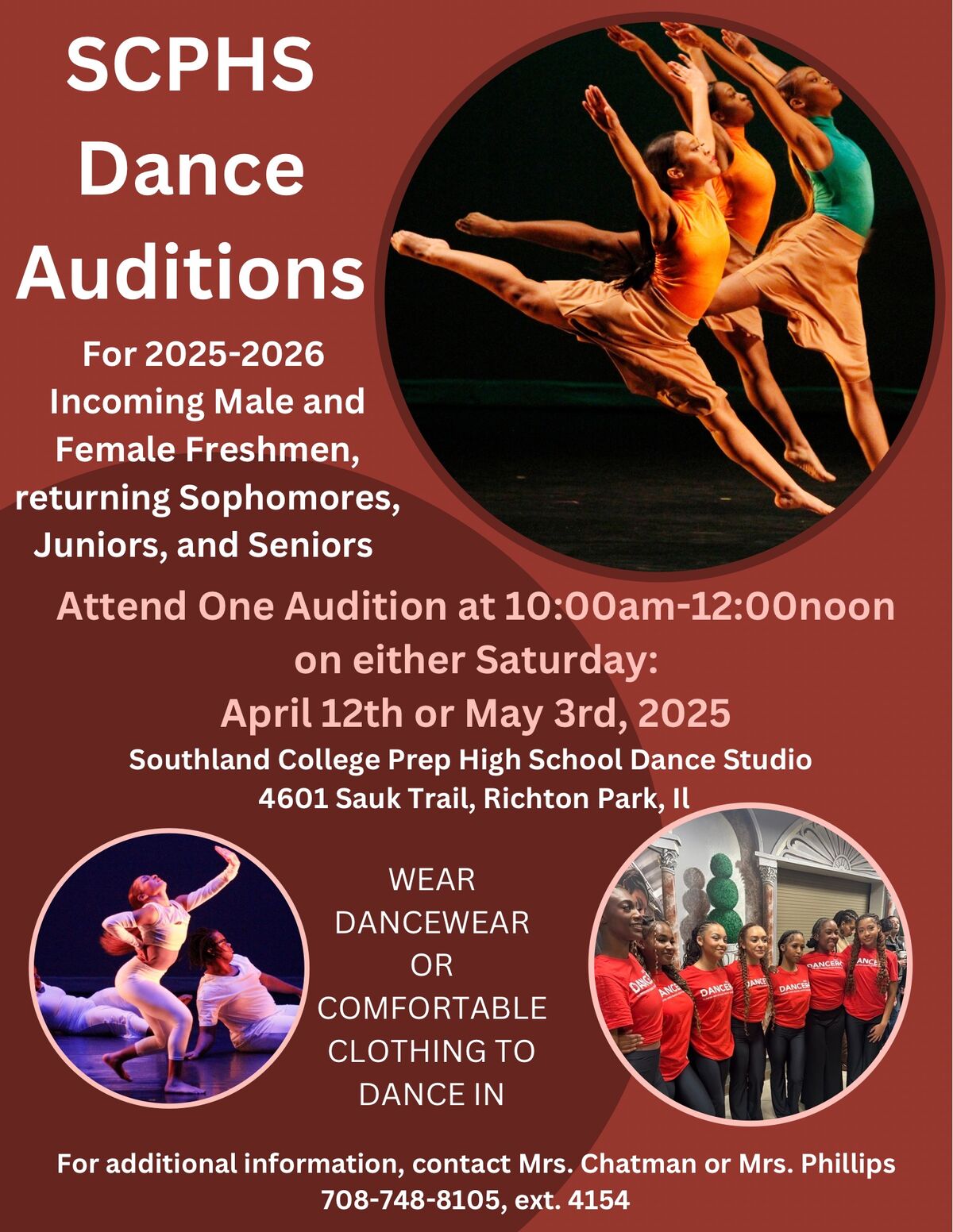 This is a reminder that Dance auditions for the 2025-2026 school year will be held on tomorrow (April 12th) and again on Saturday, May 3rd, from 10:00 AM to 12:00 PM.